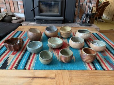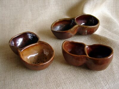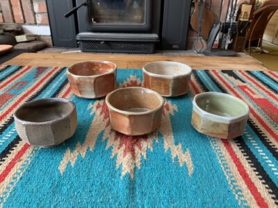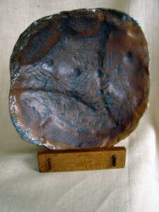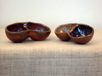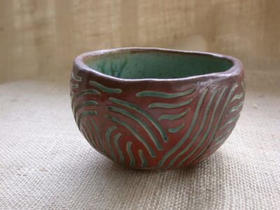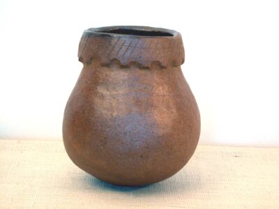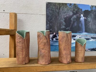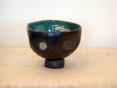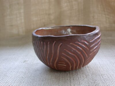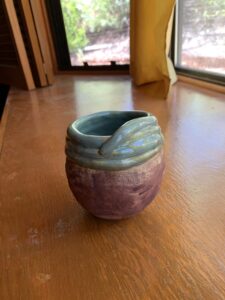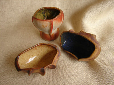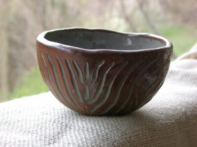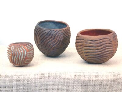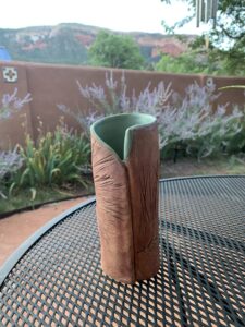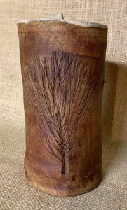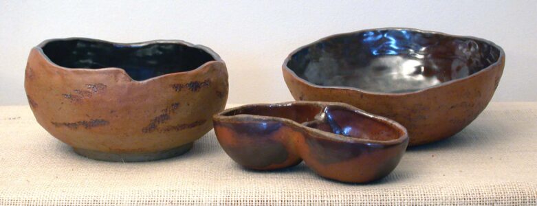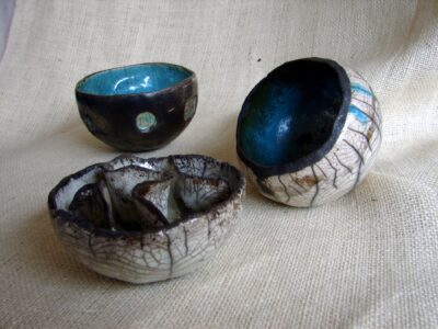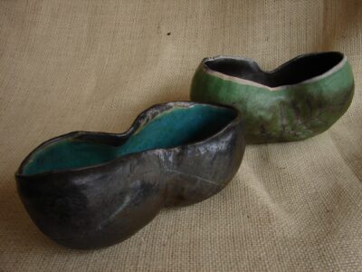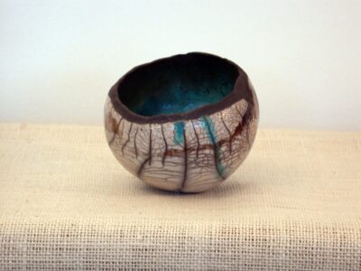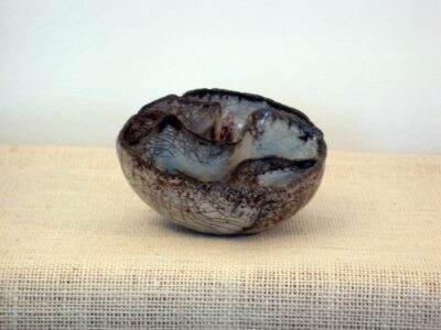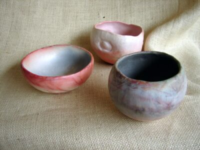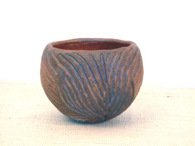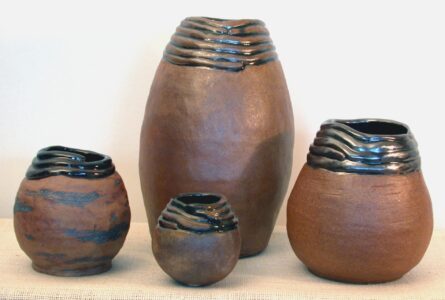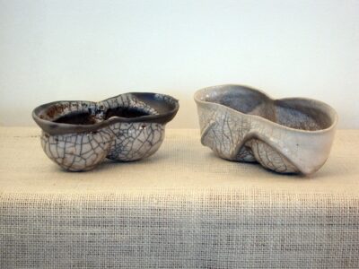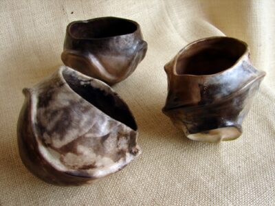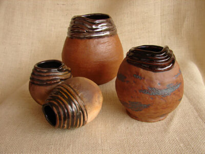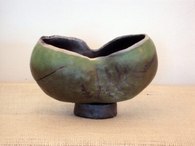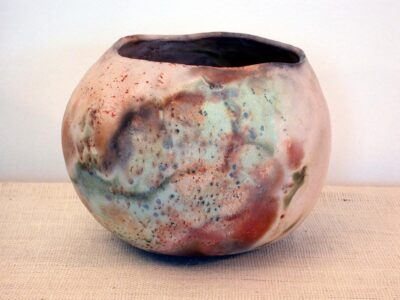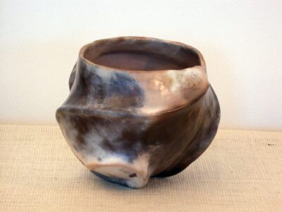 These vessels are made through pinching, coiling, and slab work primarily, although a few pieces are thrown. I prefer the slower methods of production for the meditative benefit they provide and for the natural organic shapes created. Firing methods include smoke firing, raku firing. wood firing, and electric kiln firing. Aside from the latter method of firing, the rest require the cooperation of a group of people working as a team to be successful. One of the joys of this work is the unpredictability of the results. It is exceedingly difficult to predict with any degree of certainty what will happen in these alternative firings. This can be frustrating initially, but it grounds one in the reality of life in general, its unpredictability, and the way in which one must come to terms with it and appreciate every moment while it is here.