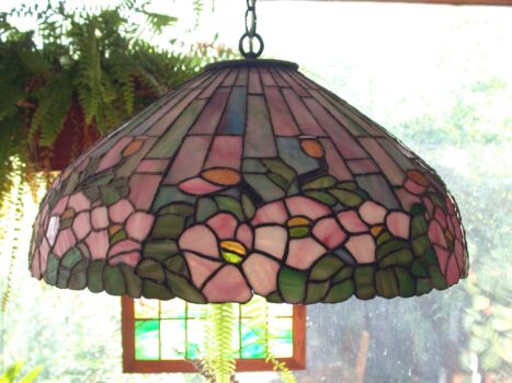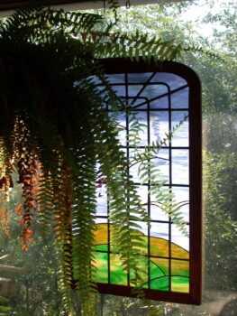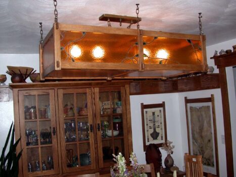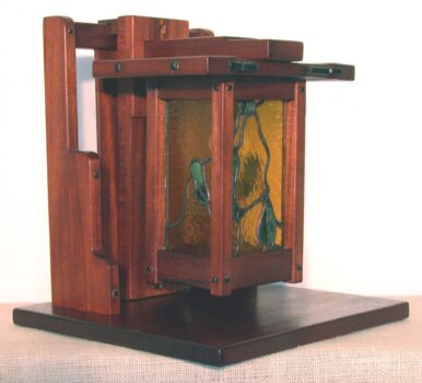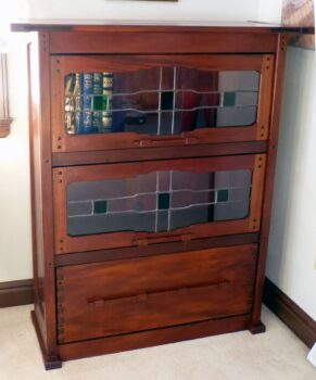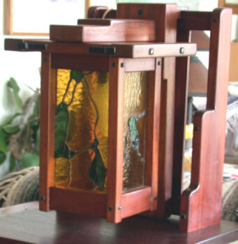 Art glass has long been used in the Arts and Crafts tradition. To me, the live oak art glass pattern incorporated in the front door of the Gamble House in Pasadena by the Greene and Greene Brothers or the Tree of Life art glass screens in the windows surrounding the Dawin D. Martin House in Buffalo by Frank Lloyd Wright are perfect examples of this marriage of wood and glass. I also enjoy incorporating these additions into my furniture or keep as stand-alone pieces. It brings an elegance and uniqueness to my pieces that reinforces the nature of handmade craftsmanship.